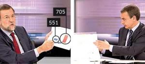 Rajoy muestra claramente un gráfico alterado en su escala, muy nítido. Mientras Zapatero muestra una hoja poco clara que da el “lamparazo” en TV e impide ser apreciada por los televidentes.