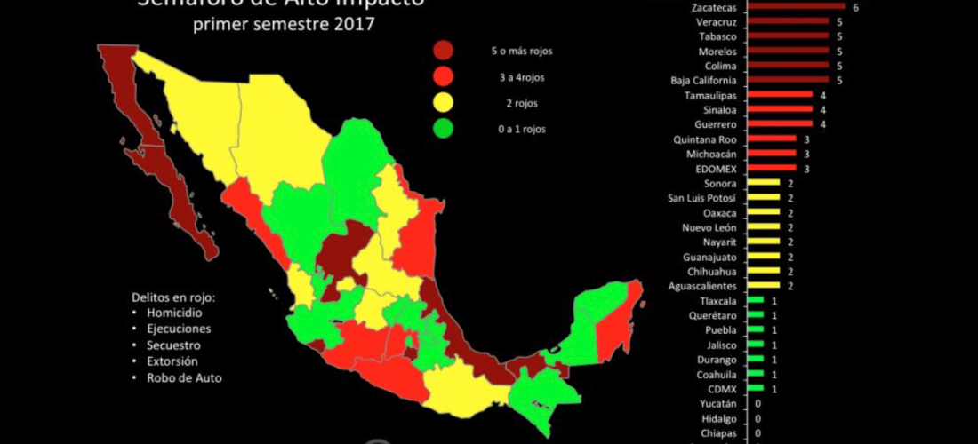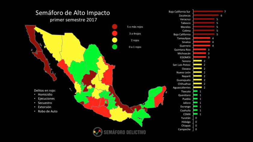 Aquí comparto un ejemplo de semaforización, sobre los delitos de alto impacto en México.